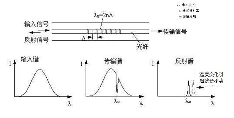 光柵也是普通單模光纖,作為光纖傳感器。但是光柵要經過特殊的加工處理以改變其折射率,使其只對特定的波長進行反射。這樣,一個寬譜的入射光經過光纖光柵后,只有滿足波長匹配條件的極小譜寬的光信號被反射,其余波長的光信號透射進入下一個光纖光柵。當環境溫度變化時,光纖光柵的反射光中心波長會隨之改變(溫度越高,波長偏移量越大)。通過對待測光柵的反射光中心波長進行數字化精確測量,即可獲得該光柵位置的環境溫度,如圖1所示。