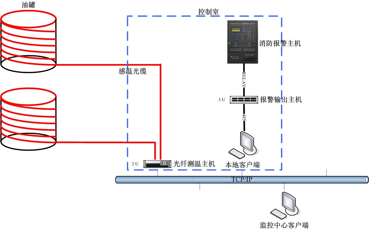 迅捷光通科技有限公司適時地開發出線型光纖感溫火災探測系統,實時對油罐進行溫度監測,并進行預警和報警,將火災消滅在萌芽階段。傳統測溫方式采用的是電信號測量,容易帶來不安全因素;該系統采用了全光纖傳感無源測溫方式,消除了監測系統自身的安全隱患,極大提高了監測系統對油罐溫度監測的可用性。