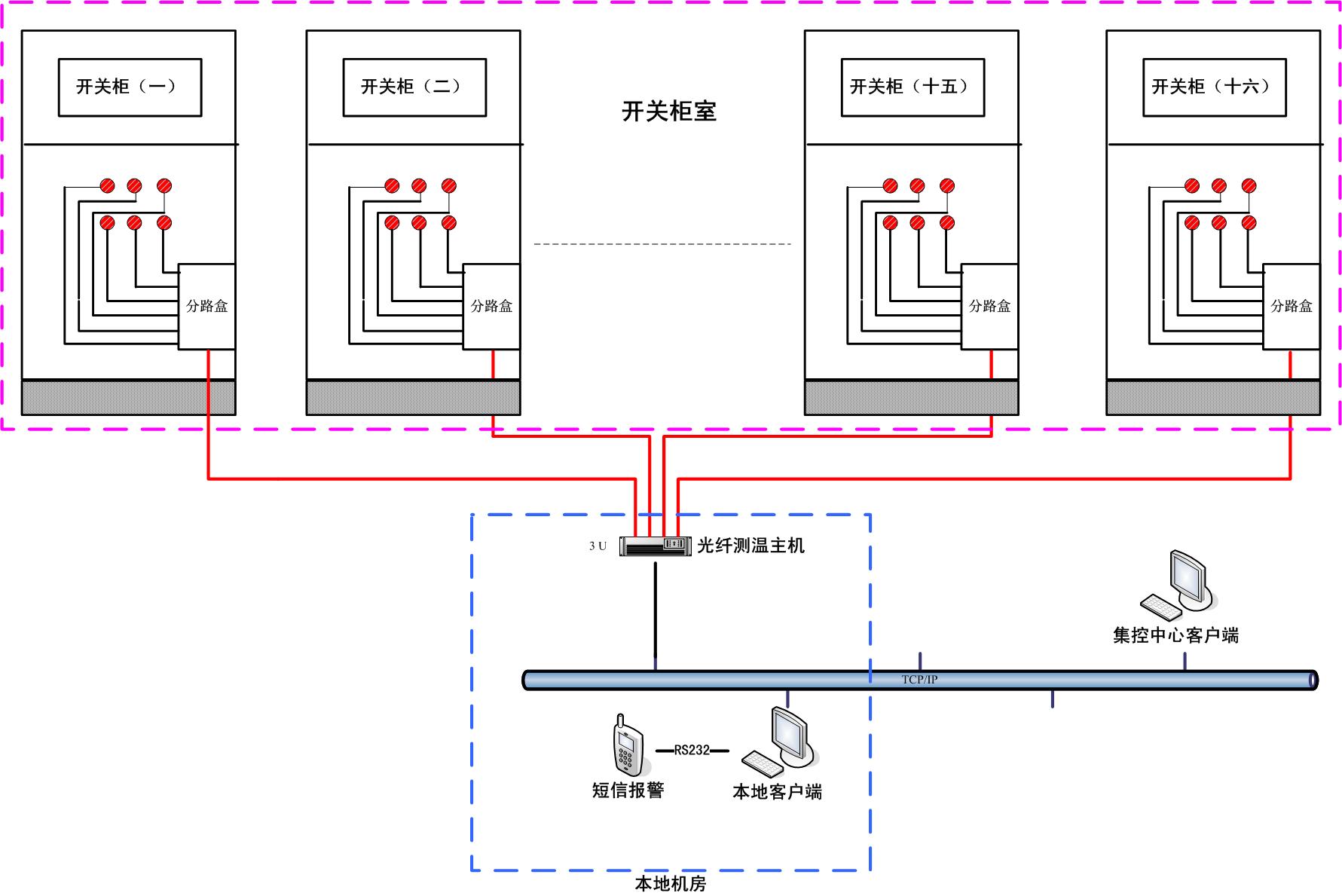 為此,迅捷光通科技有限公司基于光纖測溫傳感技術,適時地開發出光纖光柵感溫火災探測系統,實時對開關柜進行溫度監測,并進行預警和報警。該系統采用了全光纖傳感無源測溫方式,消除了監測系統自身的安全隱患,極大提高了監測系統對電力溫度監測的可用性。該光纖測溫系統被很多電廠和供電公司使用,大大降低了火災事故的發生,真正地做到防患于未然,符合電力行業“安全第一,預防為主”的安全思想。
