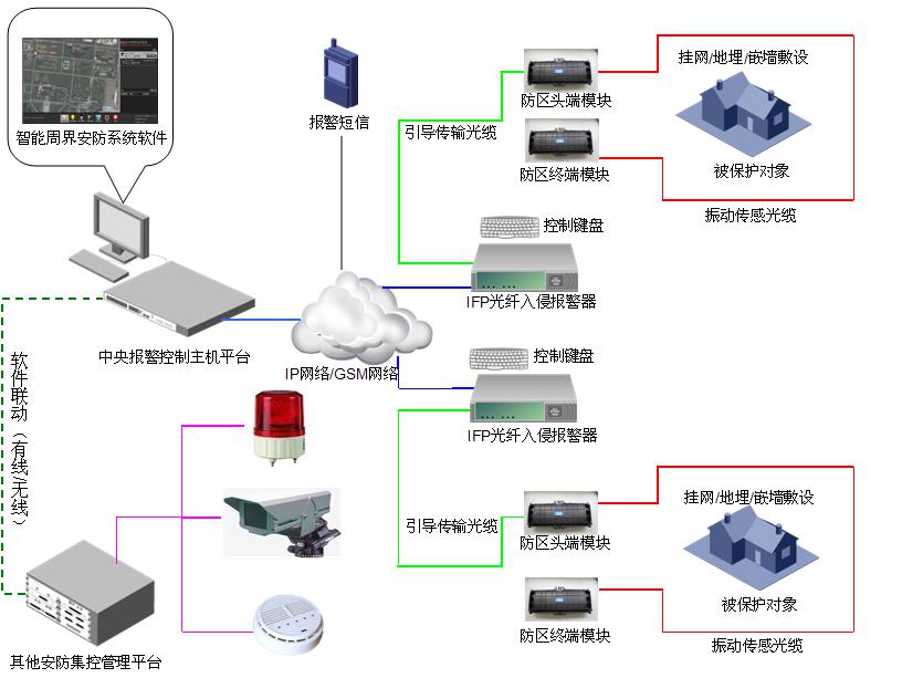 視項目大小,光纖入侵報警器IFP3800-IC08系列可獨立工作,也可采用網絡連接方式,將多臺設備聯網利用管理軟件集中管理,通過輸出開關量實現硬件聯動,通過管理軟件實現軟件聯動。對于較為重要的場所,還可在系統中接入聯動攝像機進行報警視頻復核。